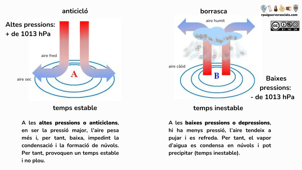 - Anticicló o alta pressió : l’aire fred pesa més que el càlid, per la qual cosa baixa i es fa més sec, i no genera precipitacions.