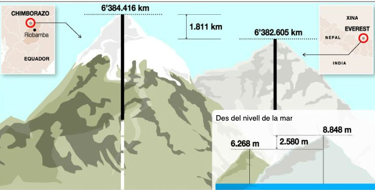 Quan es demana a qualsevol persona quina és la muntanya més alta del món, de manera immediata tothom contesta que és l’Everest. Però ara, fruit de la recerca d’un grup de científics francesos i equatorians es van proposar a principis de 2016 mesurar el punt més allunyat del centre de la Terra. Sabien que les latituds properes a la línia equatorial estan més allunyades del nucli terrestre. Per això es van traslladar a l’Equador. Van col·locar al cim de la seva muntanya més alta 6268 metres sobre el nivell del mar- un sistema GPS. I els resultats van desmuntar el mite que l’Everest és la muntanya més alta.