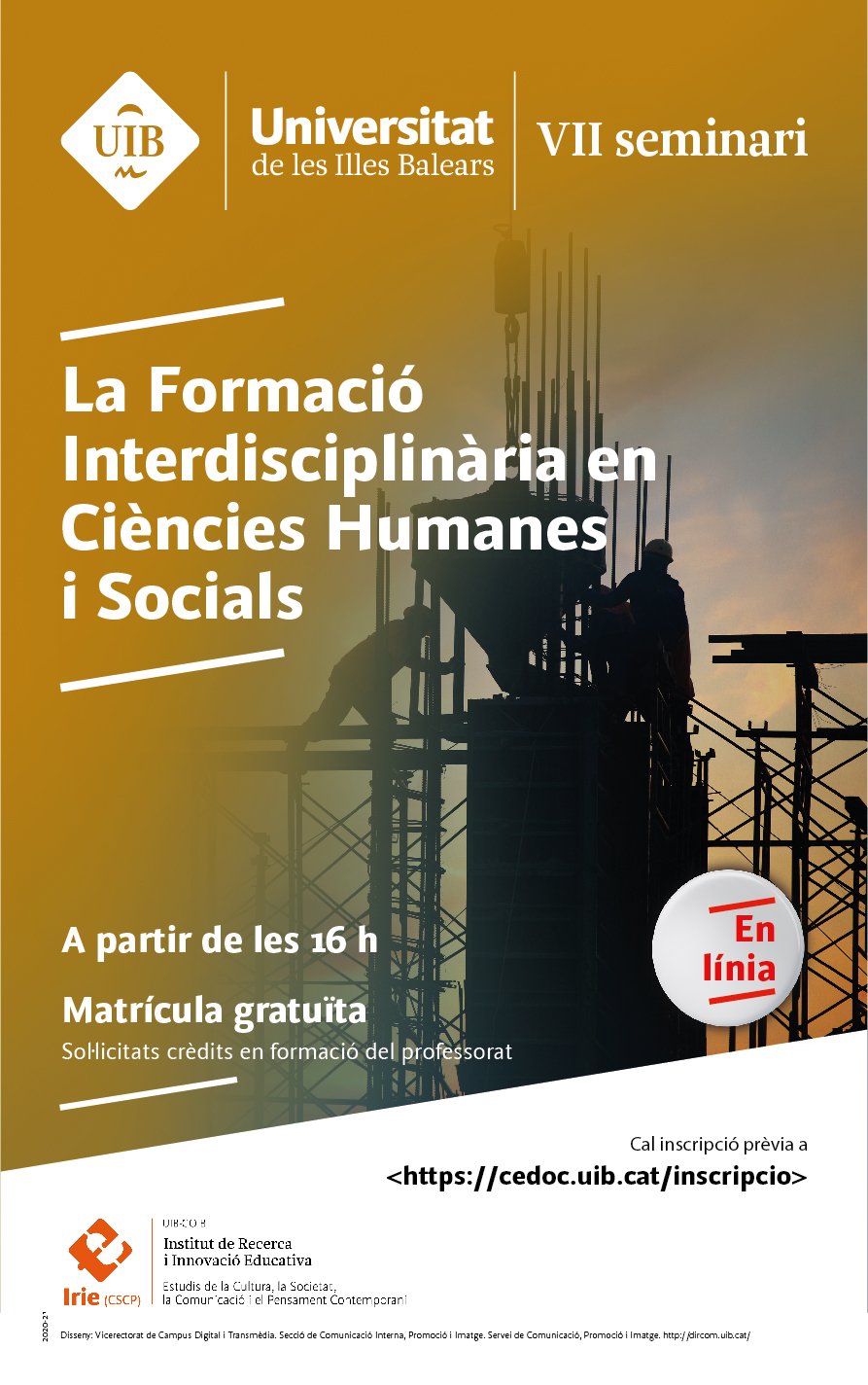Tots els divendres d’aquest mes de març es dur a terme una nova edició del seminari “La formació interdisciplinària en Ciències Humanes i Socials”, que organitza el grup Estudis de la Cultura, la Societat, la Comunicació i el Pensament contemporani de l’Institut de Recerca i Innovació Educativa (IRIE) – UIB. Enguany a causa de les restriccions per mor de la covid es farà en modalitat en línia a través de la plataforma ZOOM a partir de les 16 hores.