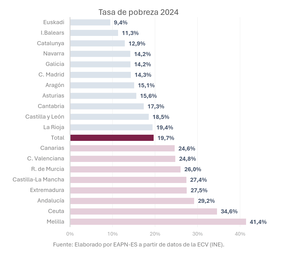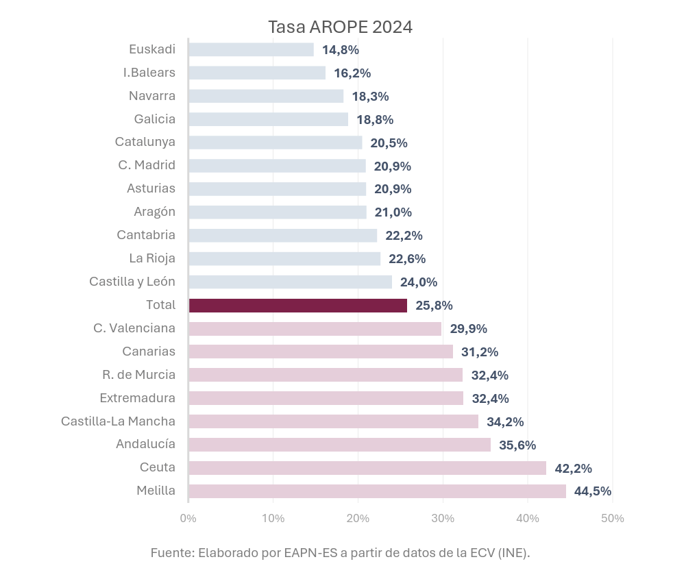 | Desigualtat territorial | Hi ha una gran disparitat entre el nord i el sud, amb taxes AROPE significativament més baixes al País Basc o Navarra, i més altes a regions com Canàries, Múrcia o Andalusia. En el cas de la Comunitat de Madrid, registra una de les rendes mitjanes per persona més altes de l’Estat i, tot i això, és una de les regions més desiguals. Aquí, el 20% més ric guanya cinc vegades més que el més pobre. |