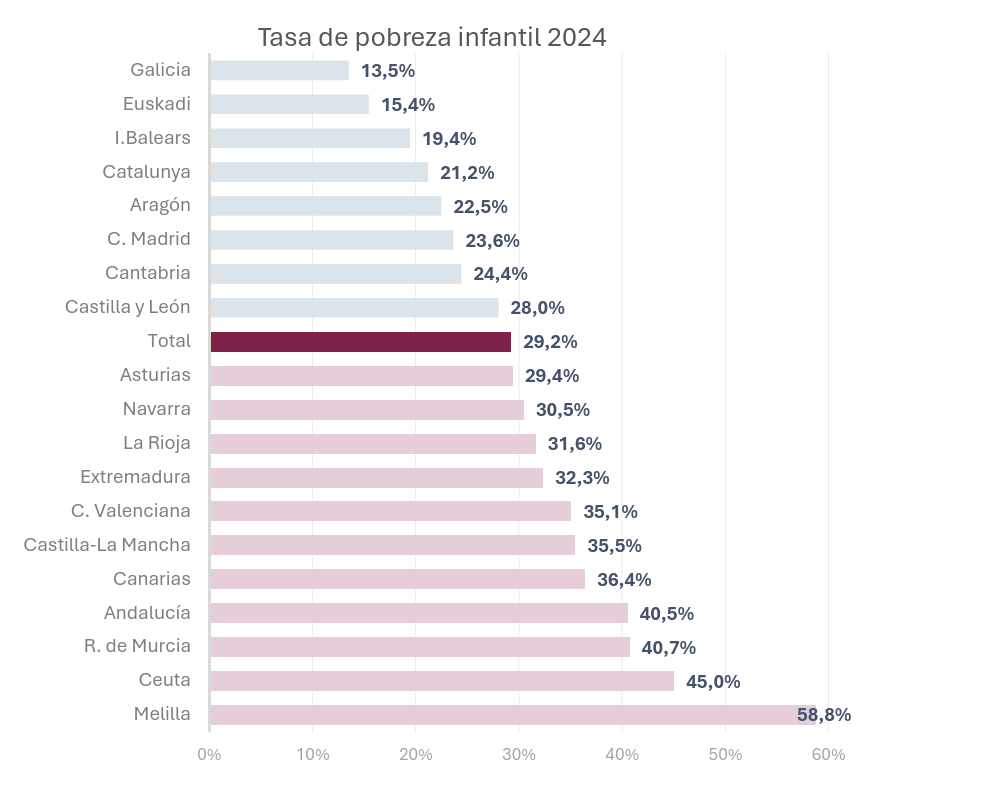 | Pobresa infantil | Espanya és el quart Estat amb més percentatge de persones en aquesta situació, només per darrere de Bulgària, Romania i Grècia. Però a més a més, té la taxa de pobresa infantil més alta de la UE, amb uns 2,3 milions de menors pobres. |