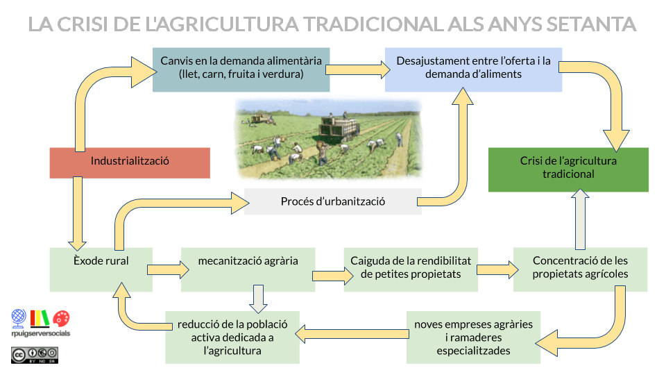 Durant els primers anys de la postguerra, l’agricultura espanyola va quedar reduïda a les més estrictes condicions de subsistència amb abundant mà d’obra i escassa mecanització. A partir de 1959, i a remolc del procés d’industrialització, es va produir la crisi d’aquesta agricultura tradicional. Dos van ser els factors fonamentals que van propiciar la transformació de l’agricultura: