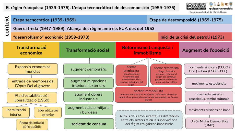 El franquisme va mirar de modernitzar-se mitjançant una obertura sense canvis democràtics, s’institucionalitzà amb la finalitat de dotar-se d’una continuïtat i cercà noves formes de legitimació que van provocar importants dissensions entre tecnòcrates, falangistes i catòlics. Enfront dels canvis socials i al reforçament de l’oposició, el règim es barallava entre dues opcions, apostar per un aperturisme controlat, opció preferida pels tecnòcrates de l’Opus Dei, o bé apostar per un immobilisme total, preferit pels falangistes i militars.