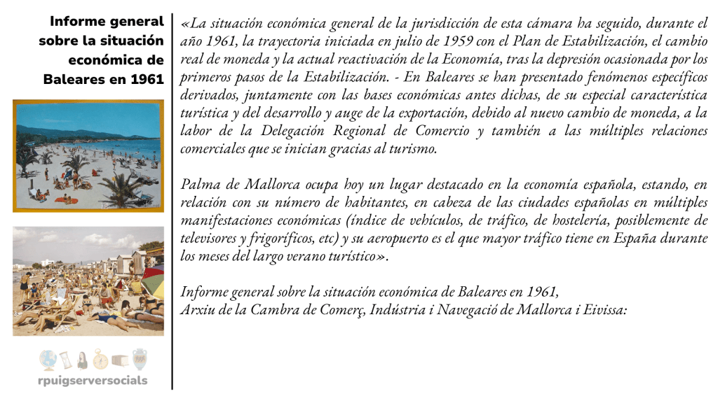 EI Pla d’Estabilització de 1959 va permetre l’inici de la gran transformació econòmica i social de les Balears en el segle XX. El règim franquista reservà a les Balears el paper de subministradores de divises a baix preu i de receptores de mà d’obra procedent de les zones més pobres de l’Estat. Com a conseqüència, la societat illenca conegué uns canvis espectaculars. La devaluació del canvi exterior de la pesseta, acordat amb el Pla d’Estabilització i la creació d’una important xarxa d’allotjaments, serveis complementaris i comunicacions, permeteren que al llarg dels anys seixanta s produís un autèntic bot qualitatiu dins el procés d’expansió dels serveis turístics a l’arxipèlag.