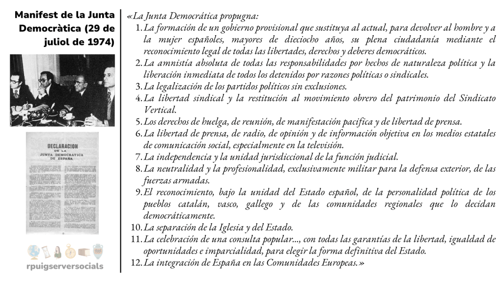 El PCE, que és el grup d’oposició més important, impulsa juntament amb altres grups la junta Democràtica d’Espanya, que es crea el juliol de 1974. En el seu programa, la Junta Democràtica defensava la formació d’un govern provisional que reconegués les llibertats democràtiques (dret de vot, dret d’associació, dret de reunió, etc.), atorgués l’amnistia als presos polítics, legalitzés tots els partits polítics i sindicats, establís les llibertats sindicals (dret de vaga, sindicació lliure, etc.) i proclamés el dret a l’autonomia de Catalunya, el País Basc i Galícia trencant amb l’Estat centralista característic del règim franquista. El PSOE –que era més feble i des de 1974 és dirigit per Felipe González– impulsa la Plataforma de Convergència Democràtica. A Catalunya –on l’oposició té considerable força- es crea l’Assemblea de Catalunya (1971) que reclama llibertat, amnistia i estatut d’autonomia.