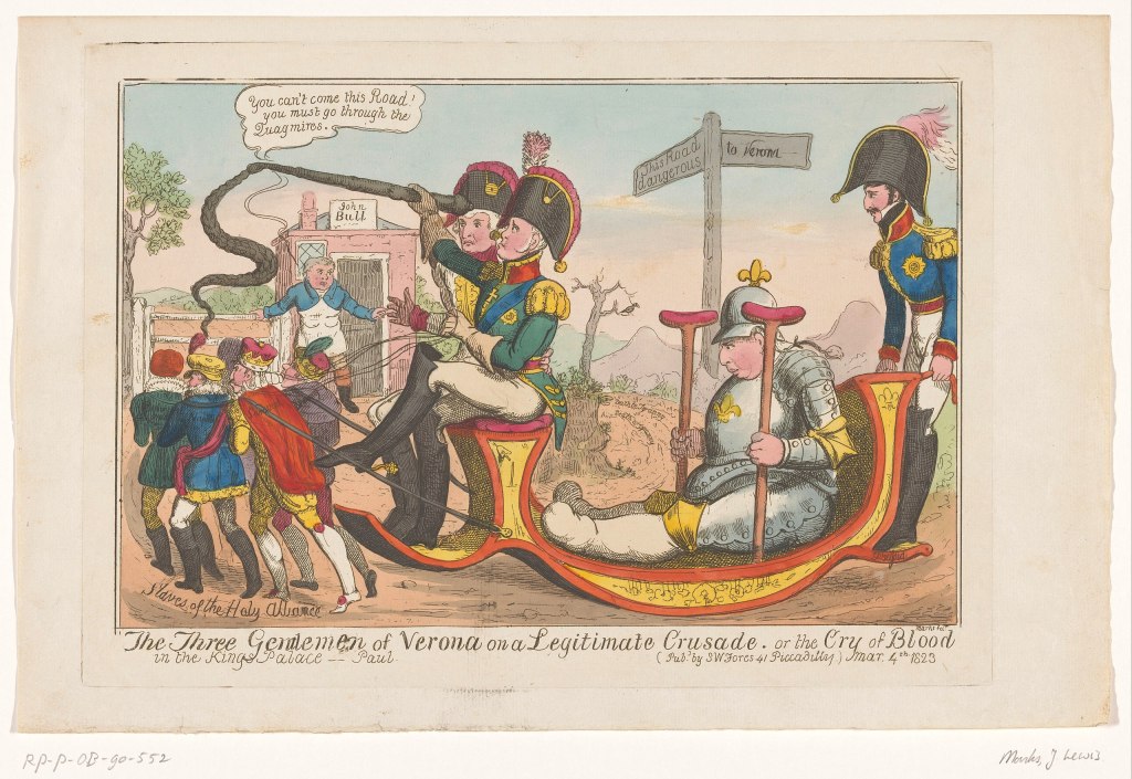 Ferran VII sempre va ser contrari a la nova situació i va demanar ajuda als monarques absoluts d’Europa per derrotar els liberals. La intervenció militar de la Santa Aliança, sol·licitada d’amagat pel rei, fou decidida suposadament pel congrés de Verona (octubre-desembre del 1822), que l’encarregà a França.