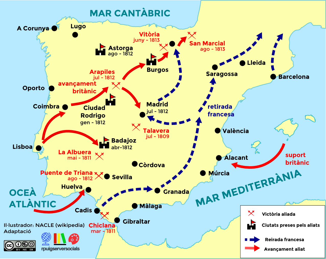 La derrota napoleònica (1812-1814). A partir de 1812 Napoleó va iniciar un front a Rússia, fet que el va forçar a retirar efectius de la Península. Aquest fet va permetre a les tropes espanyoles, amb l’ajuda de la guerrilla i de l’exèrcit britànic comandades pel general Wellington, algunes victòries entre les que destaca la d’Arapiles el juliol del 1812. A partir d’aquesta derrota francesa, Josep I va abandonar definitivament Madrid. Incapaç de mantenir els dos fronts, el 1813 es va firmar el Tractat de Valençay, pel qual Ferran VII recuperava la Corona i Napoleó retirava les seves tropes.