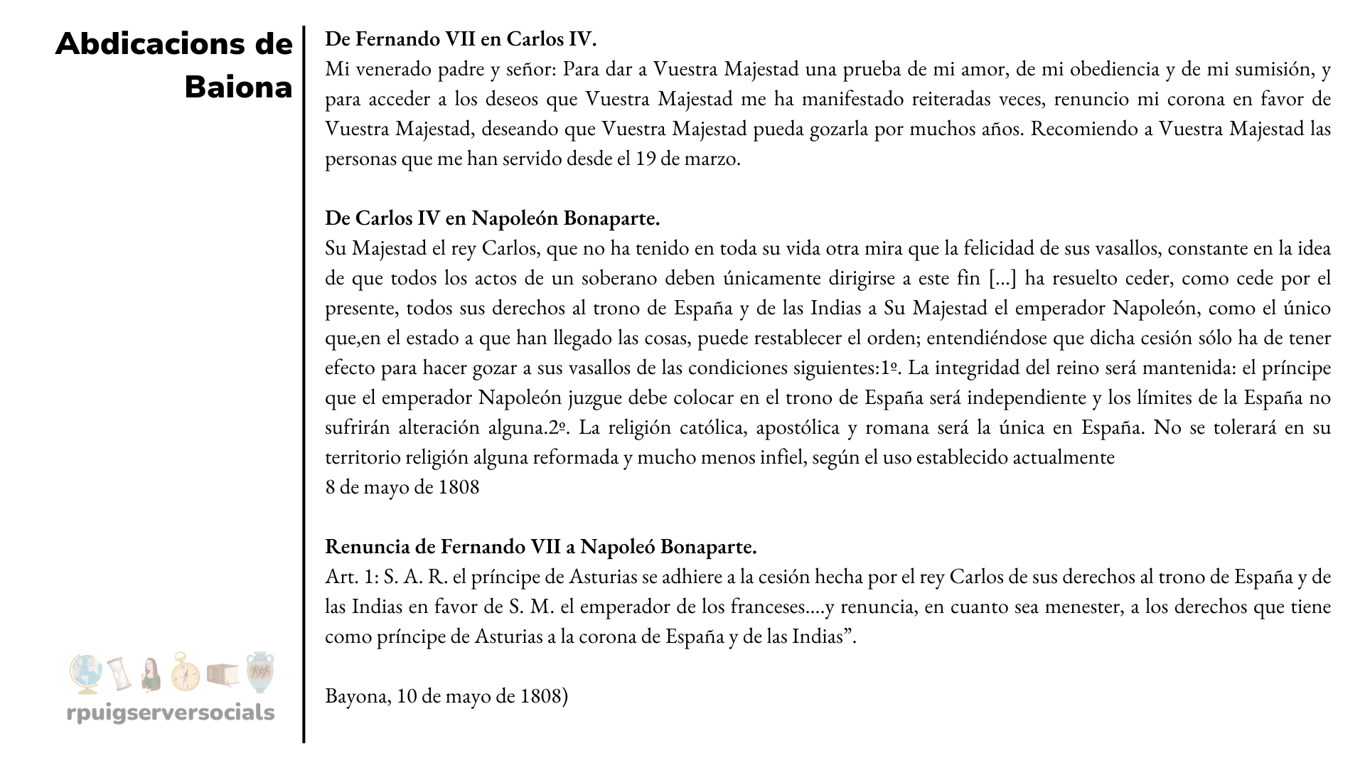 Les abdicacions de Baiona van suposar la renúncia a la corona espanyola per part Carles IV i del seu fill Ferran VII. Al seu torn, es reconeixia Napoleó com a àrbitre de la situació, que va decidir nomenar rei el seu propi germà, Josep I Bonaparte (1808-1813). El nou monarca va començar una tasca de reforma de l’Estat per imposar les idees lliberals de la Revolució Francesa. Per a aquesta tasca trobaren un nombrós grup de liberals espanyols que seran el seu gran suport, sent coneguts com a afrancesats.
