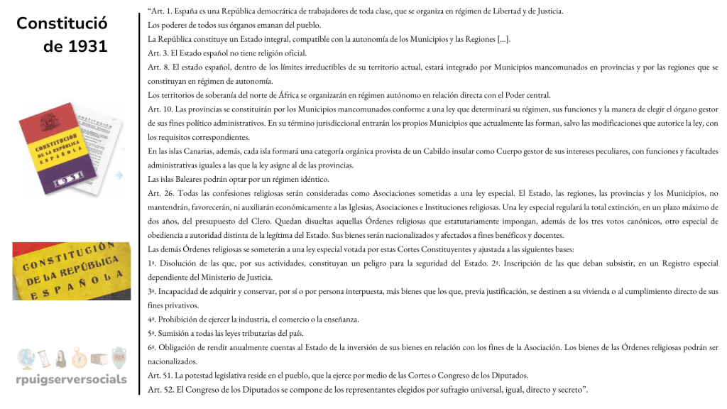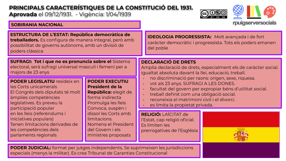- Consolidació de la democràcia: es reconeixia el sufragi universal masculí i femení i s’establia la divisió de poders. El poder legislatiu residia a les Corts, el poder executiu, en el Consell de Ministres i en el President de la República.