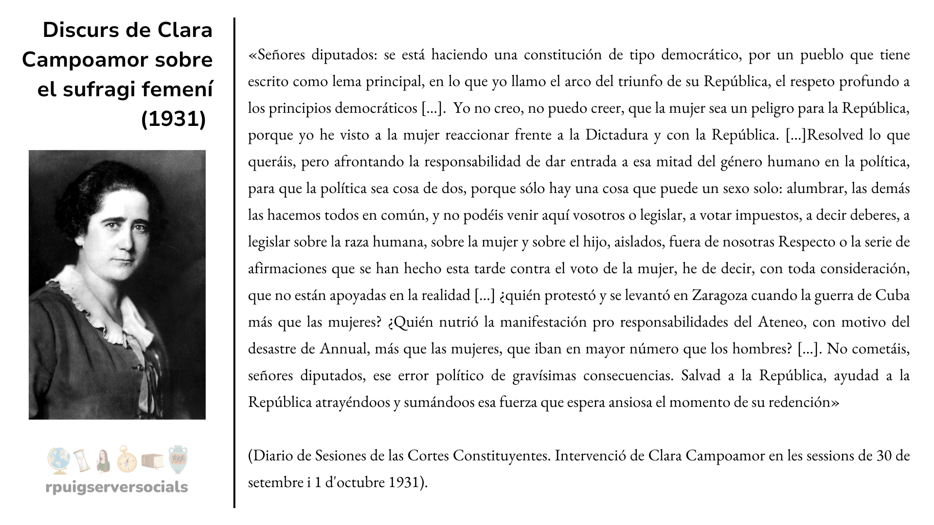 En els debats parlamentaris Clara Campoamor es va quedar sola defensant el dret democràtic de les dones a votar a costa de la mateixa posició en el Partit Radical en què militava i enfrontant-se a les habituals campanyes que argumentaven la insuficiència en voluntat i intel·ligència del sexe femení. Per contra, Victoria Kent i Margarita Nelken s’hi va oposar seguint la disciplina del partit, és a dir, al·legant que el vot de les dones donaria la victòria als partits de dretes per estar massa influenciades per l’Església i pels seus marits. Malgrat això, l’1 d’octubre de 1931 es va aprovar el sufragi femení per 161 vots a favor i 121 en contra. Hi varen votar a favor el PSOE, amb excepcions, petits partits republicans i també diputats de la dreta, conscients que el vot femení seria majoritàriament conservador. Les dones varen poder votar a Espanya per primera vegada a les eleccions de 1933.