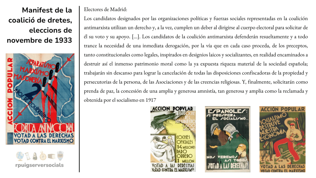 La Confederación Española de Derechas Autónomas (CEDA), sorgida el 1933, va comptar amb un líder indiscutible: José María Gil Robles capaç d’atreure a un gran nombre d’afiliats. Així mateix, la monàrquica Renovación Española de José Calvo Sotelo, la Comunión Tradicionalista dels carlins i molt especialment els grups d’inspiració clarament feixista com les JONS i Falange Española, liderada per José Antonio Primo de Rivera, fill del dictador, malgrat ser minoritaris, van dur a terme una intensa activitat d’agitació contra tot el que consideraven el perill d’una revolució bolxevic. Amb les seves acusacions van aconseguir crear un clima de crispació que va acabar arrossegant el conjunt de la dreta. N’és una bona bona mostra el seu manifest de campanya.