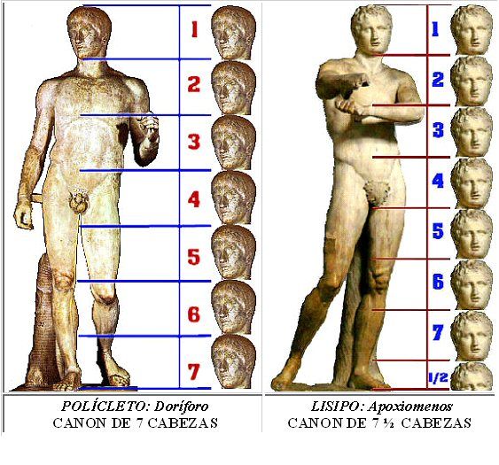 - Utilització de cànons per trobar relació-proporció matemàtica entre les parts de la figura- Policlet el Vell utilitzà el cànon 1/7 en obres com El Dorífor o el Diadumen, és a dir, l’alçada del cos és 7 vegades la mida del cap.