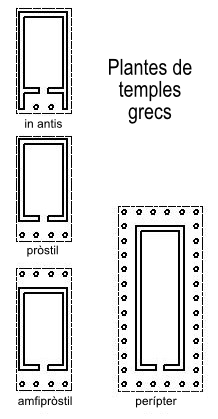 - Classificació per columnes: In antis (dues columnes al davant), Pròstil (pòrtic frontal), Amfipròstil (pòrtic davant i darrere) i Perípter (envoltat de columnes).