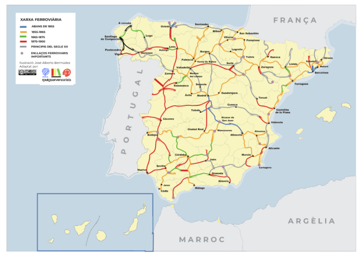 El primer ferrocarril a l’Espanya peninsular va ser el de Barcelona a Mataró (1848), però la línia general de la xarxa es va fer a partir de la Llei de Ferrocarrils (1855), que va afavorir la inversió estrangera.
