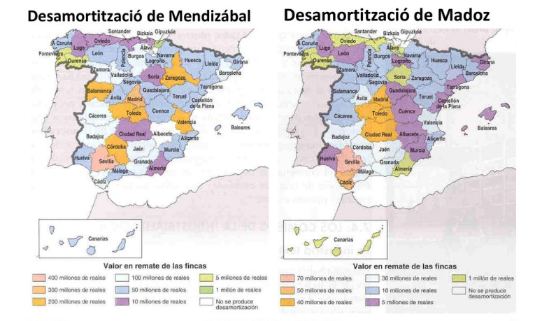 - Les desamortitzacions i en especial la de Mendizábal pretenien millorar la distribució de la terra, creant una capa de propietaris mitjans. En la pràctica això va fracassar, ja que moltes de les propietats desamortitzades serviren per incrementar o crear noves grans propietats, en vendre’s en grans lots de terra. Si és cert que molts dels nous propietaris, procedents de la burgesia comercial, es preocuparen per millorar els conreus, augmentant la productivitat. També varen servir per invertir en ferrocarril, l’exèrcit i per reduir el deute de l’Estat.
