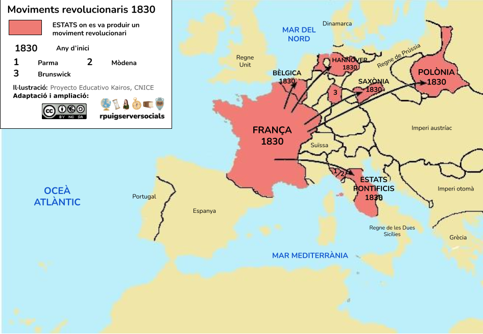 - A França, París es va omplir de barricades i Carles X de Borbó va abdicar davant el malestar popular. La Santa Aliança no permetria una nova República; per aquest motiu, el 1830 els liberals francesos van oferir el tron a Lluís Felip d’Orleans per tal d’instaurar una monarquia constitucional amb un govern liberal moderat.