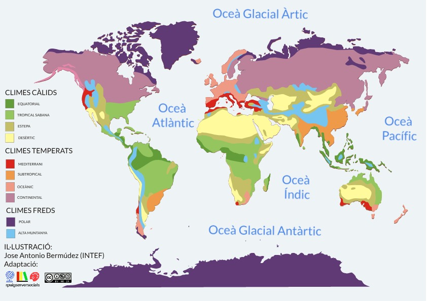 Els continents són grans masses de terra envoltades de mars i oceans. De més gran a més petit, els continents són: Àsia, Amèrica (Amèrica del Nord i del Sud), Àfrica, l’Antàrtida, Europa i Oceania. Les illes són masses de terra envoltades d’aigua. Algunes illes formen grups anomenats arxipèlags, com les Canàries o les illes del Japó.