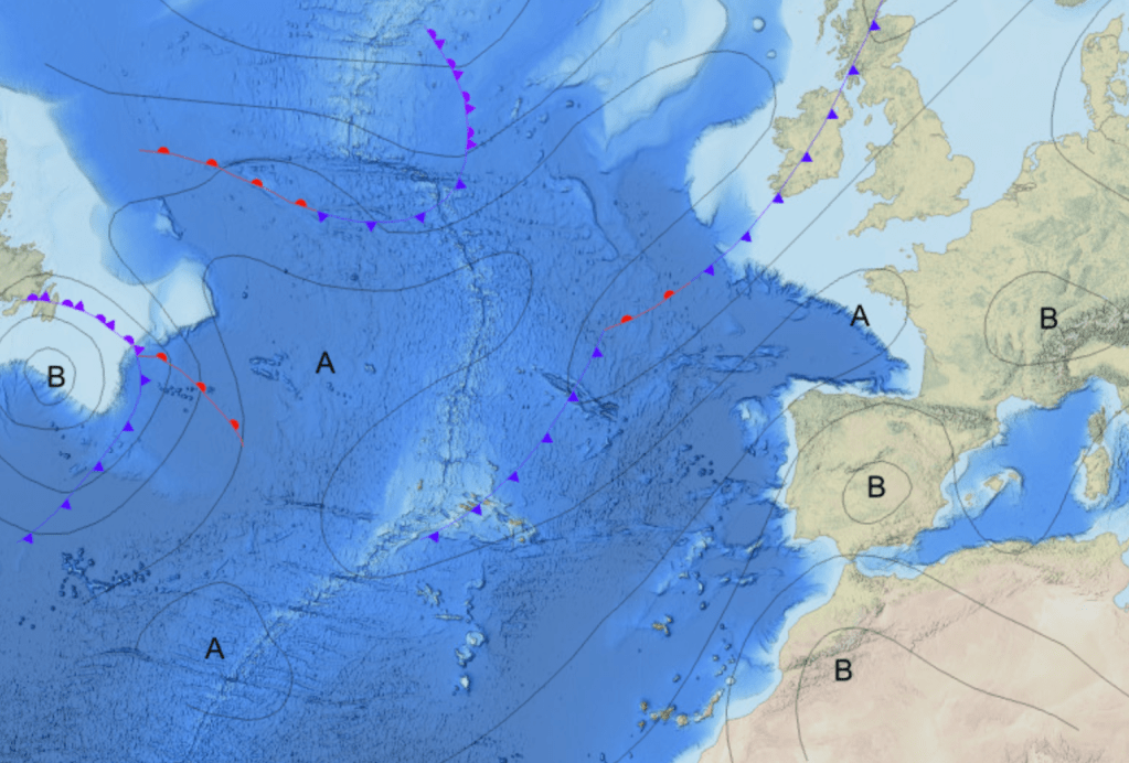 - Altes pressions sobre la península ibèrica (a causa de la presència de l’anticicló continental europeu, l’anticicló de les Açores, o tots dos).