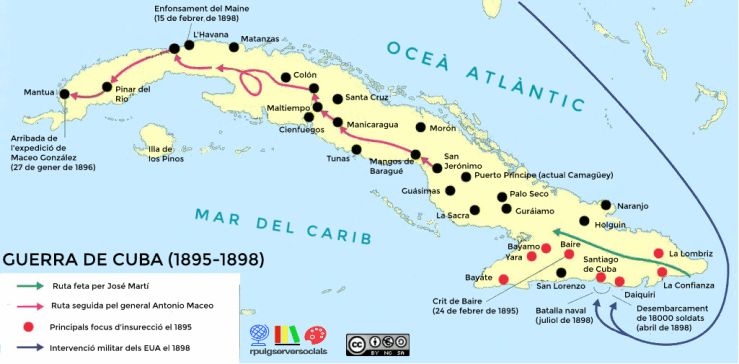 En aquest conflicte, els cubans van comptar amb el suport de Estats Units. L’enfonsament del vaixell nord-americà “Maine” al port de l’Havana (15 de febrer de 1895) va ser l’excusa utilitzada pel govern del president William McKinley per declarar la guerra a Espanya. Després de la derrota militar a Cuba, Espanya va signar el Tractat de París, pel qual renunciava a Cuba, Puerto Rico i les Filipines. Finalitzava així un procés independentista que havia començat el 1868 amb el Crit de Yara.