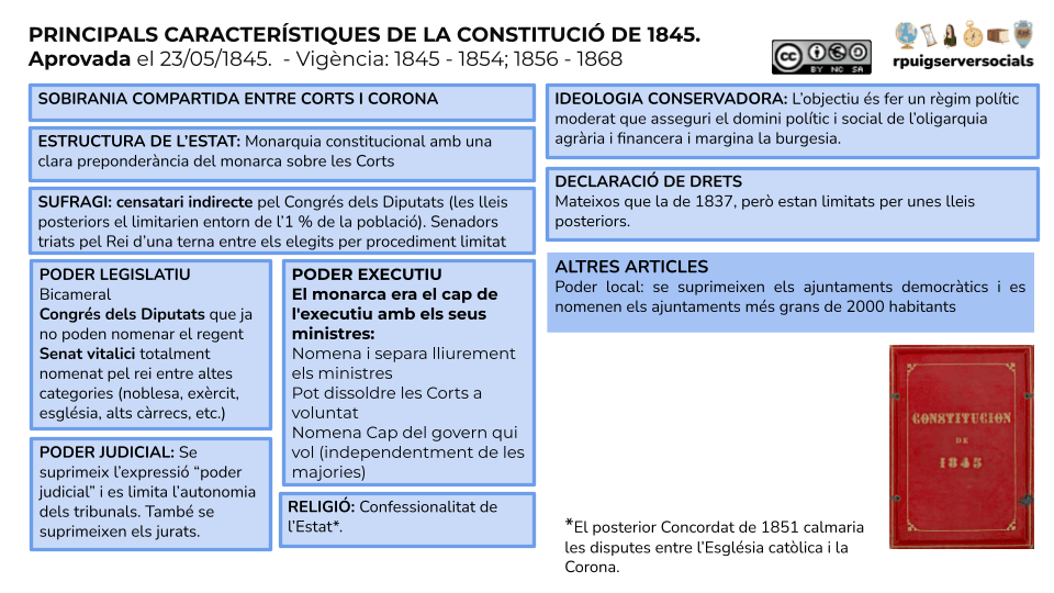 En aquest període es va aprovar la nova Constitució de 1845 i va posar les bases d’un liberalisme conservador amb la clara intenció de reformar l’Estat segons els interessos de les noves classes dirigents, amb la qual cosa es modificava diversos aspectes progressistes de la carta magna de 1837. Els punts més importants del nou document van ser: