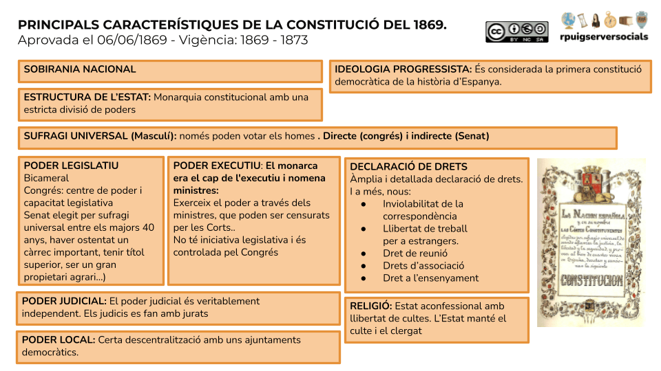 Aquestes noves Corts van aprovar la Constitució de 1869, de tall progressista, els principals punts del qual van ser: