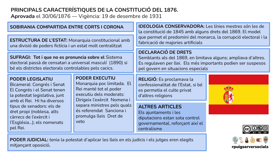 Per consolidar aquest nou ordre, es va proclamar el document base del sistema canovista: la Constitució de 1876. És fins ara la carta magna més longeva de la història d’Espanya, ja que va estar vigent fins al 1923. Es tractava d’un text breu de 89 articles, que buscava un punt intermedi entre les idees de la Dècada Moderada (Constitució de 1845) i el Sexenni Democràtic (Constitució de 1869). En definitiva era un document que intentava unir a un estat dividit, sent flexible i moderat, donant cabuda a idees conservadores i liberals. Els principals punts de la Constitució de 1876 van ser els següents: