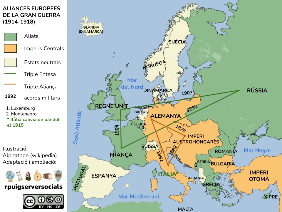 - Alemanya , membre juntament amb Àustria i Itàlia de la Triple Aliança, va declarar en ple la guerra a l’altre bloc.