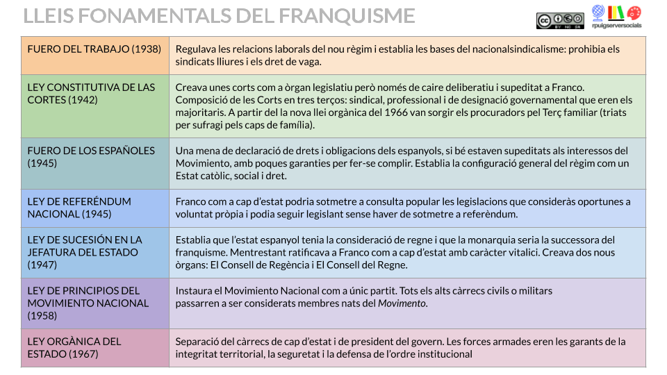 - Fuero de los Españoles (1945) era una teòrica declaració de drets i deures impregnada de la mentalitat tradicionalista i catòlica. No va suposar cap reconeixement real de drets polítics o socials.