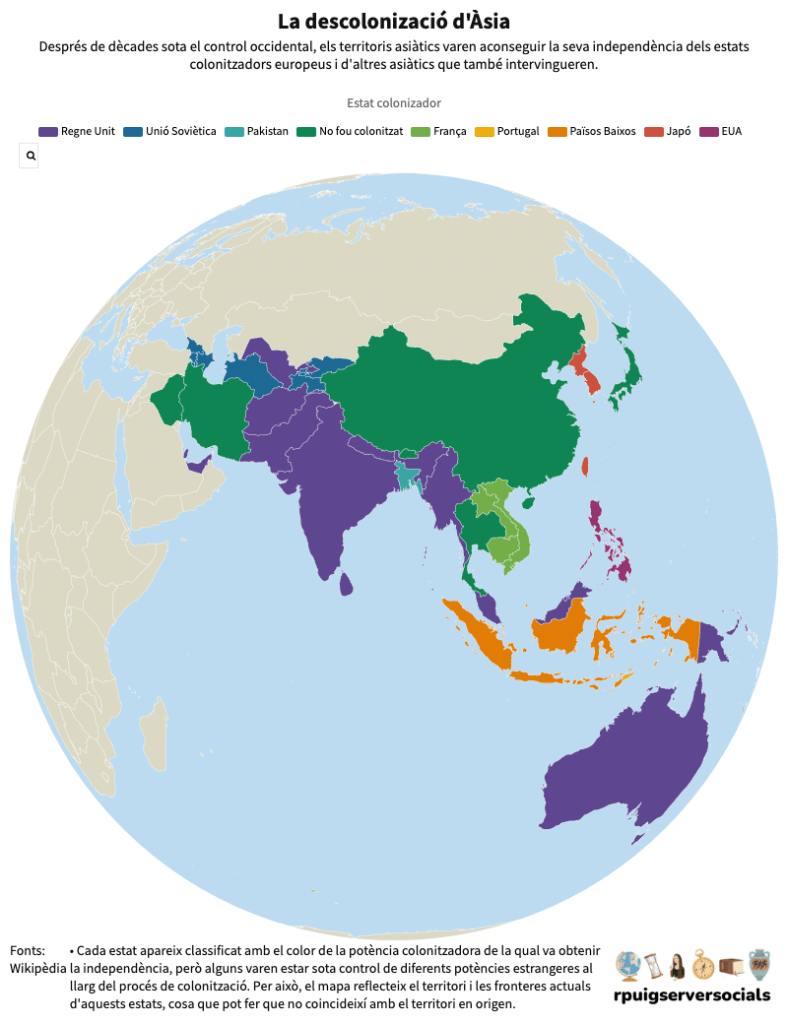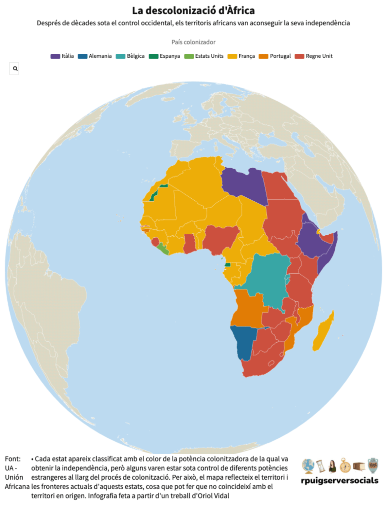 La fi dels imperis colonials, després de la Segona Guerra Mundial, constitueix un dels grans esdeveniments del segle XX. La descolonització va afectar primer sobretot el continent asiàtic i la zona del Pròxim Orient. A l’Àfrica, la descolonització va ser una mica més tardana i al sud del continent s’hi va mantenir el domini colonial fins als anys vuitanta. •Alguns països van assolir la independència per mitjà d’acords amb les metròpolis, però d’altres van haver de passar per processos molt dificultosos i guerres d’alliberament sagnants.