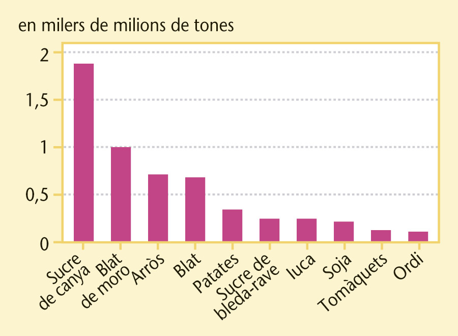 Els cereals són la font d’alimentació més important, però les noves tendències de consum (models de vida saludable) han fet augmentar la producció de vegetals i fruita fresca.