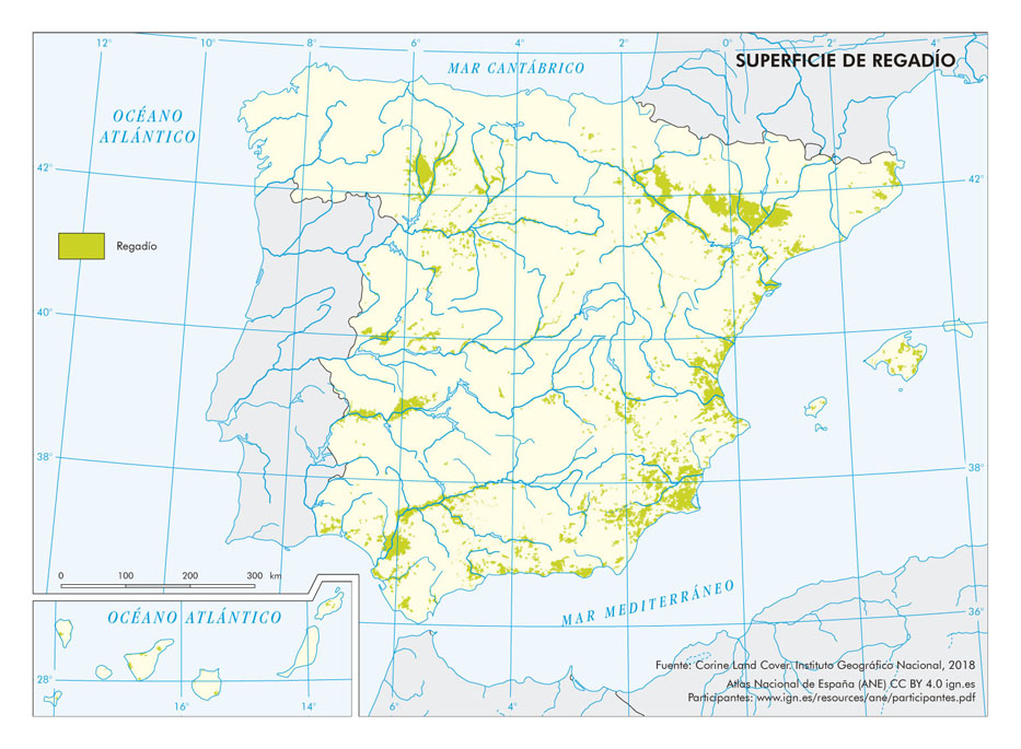 Als paisatges de regadiu l’aigua s’extreu del subsol o d’embassaments i, per mitjà de canals, es condueix cap als camps. Els conreus de secà només reben l’aigua de la pluja.