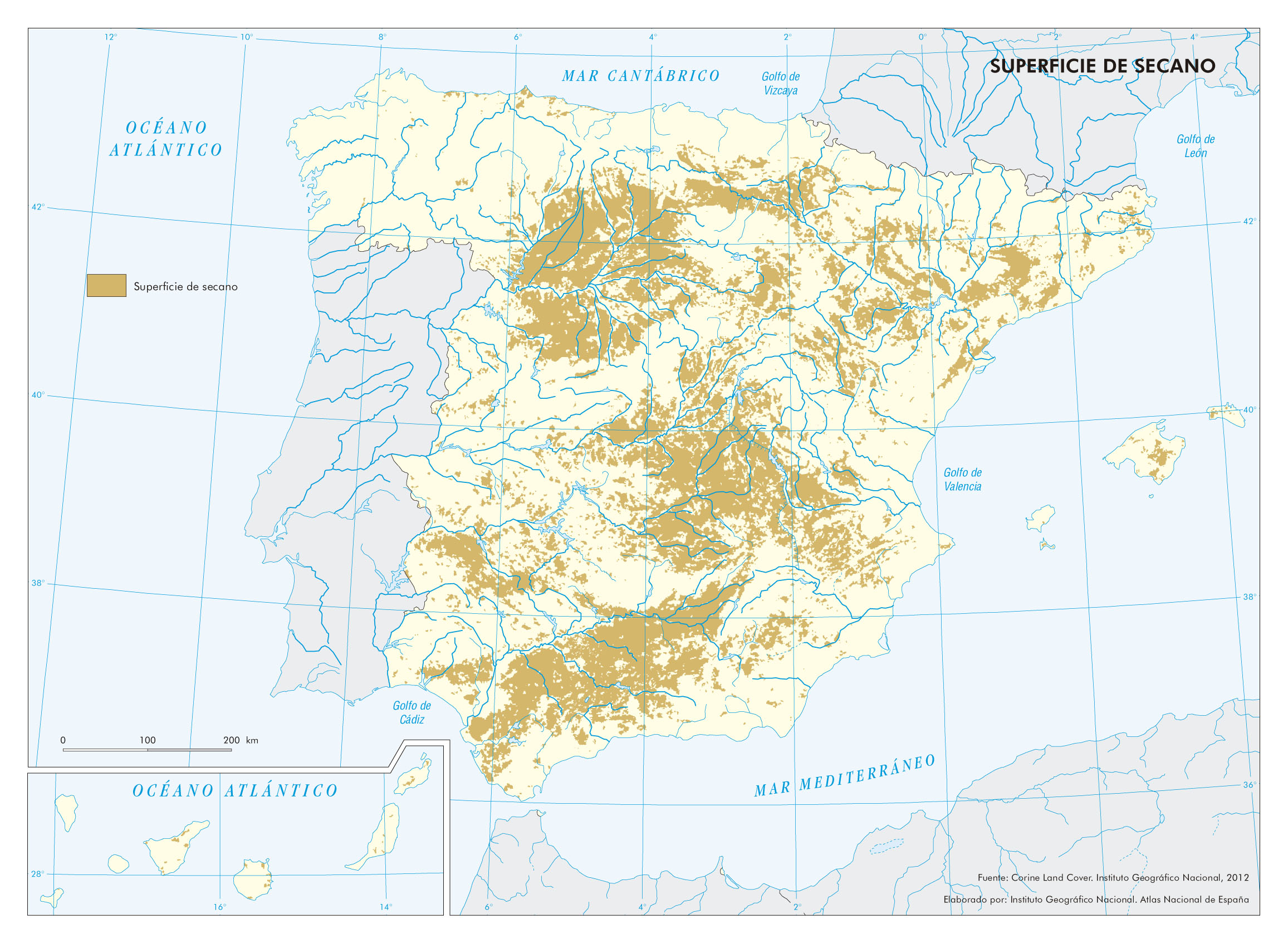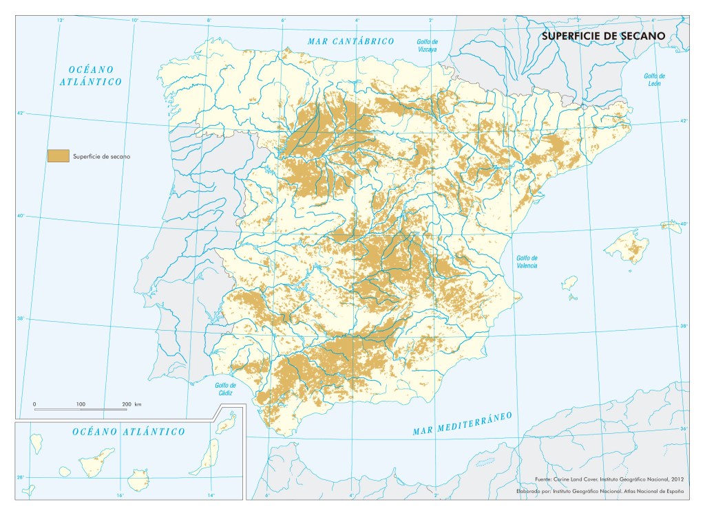 Pel que fa als conreus, destaquen els de secà, concretament, però no eclusivament, els de la trilogia mediterrània: el blat era el cereal predominant a la Península, principalment a ambdues Mesetes; la vinya s’estén a zones atlàntiques i mediterrànies i la seva producció s’ha especialitzat en vins de qualitat, i l’olivera, que es destina majoritàriament a l’oli perquè la producció d’olives és menys rendible, ocupa milions d’hectàrees a Andalusia (Jaén), Ciudad Real i Badajoz.
