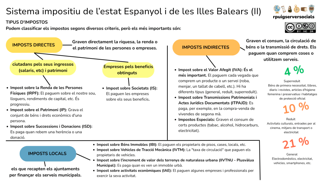 - Les Comunitats Autònomes: Com la nostra, les Illes Balears. Espanya és un “Estat de les Autonomies”, i això significa que les Comunitats Autònomes tenen moltes competències importants, com la gestió de la sanitat, l’educació, els serveis socials o el transport. Per finançar aquests serveis, reben una part dels impostos que recapta l’Estat central, i a més, tenen la capacitat de gestionar alguns impostos propis (encara que siguin menys importants) o de modificar lleugerament alguns trams dels impostos estatals.