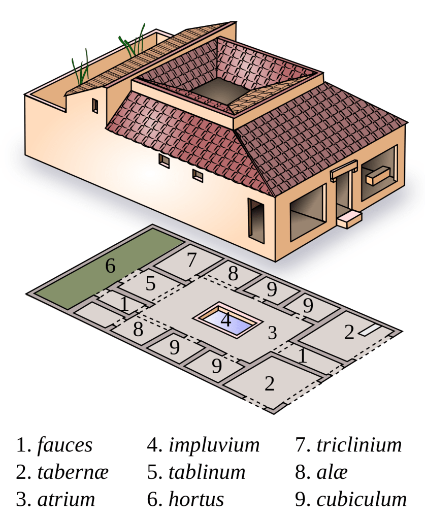 DOMUS: Casa particular romana d’estructura rectangular, caracteritzada pel compluvium que aboca l’aigua de pluja a l’impluvium. Formada també per l’atrium, el peristil i a vegades també per l’hortus.