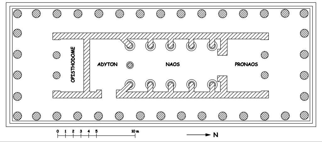 CEL·LA (NAOS): Cambra principal d’un temple grec o romà, de planta rectangular, on es guardava la imatge del déu.