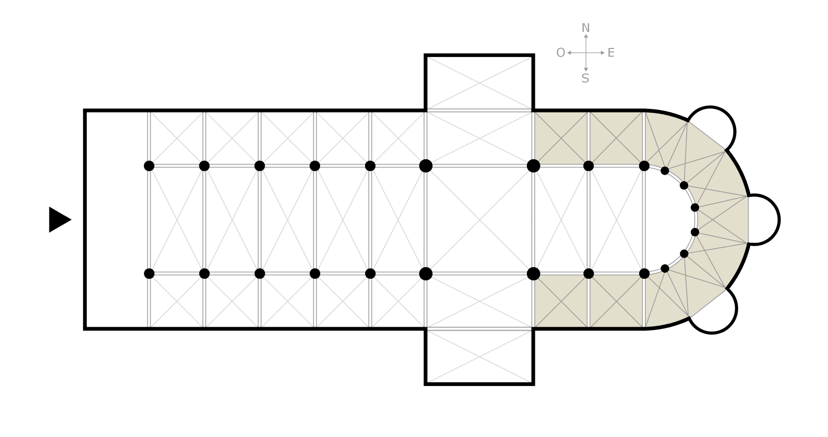 NAU: Espai comprès entre murs o columnes i arcs en un edifici. Les esglésies cristianes consten d’una o més naus.