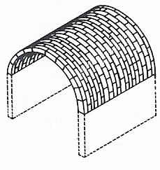 VOLTA DE CANÓ: Volta generada pel desplaçament d’un arc de mig punt al llarg d’un eix longitudinal. Típica del Romànic és molt feixuga i requereix murs gruixats i contraforts.