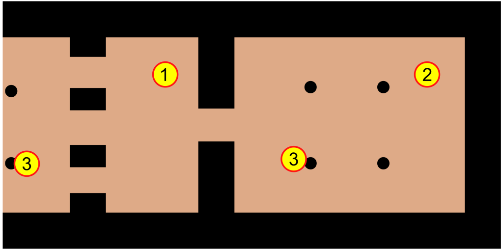 MÈGARON: Tipus d’habitatge característica de la cultura micènica la qual consta d’una sala rectangular (2), amb la llar al centre voltada de columnes (3) i un vestíbul (1).