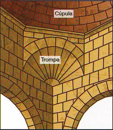 TROMPA: Petita volta semicònica amb la part ampla cap a fora, que serveix per ajustar la base circular d’una cúpula a un espai poligonal de la planta. Usades a l’art bizantí i en estils posteriors que usen arquitectura de volta.