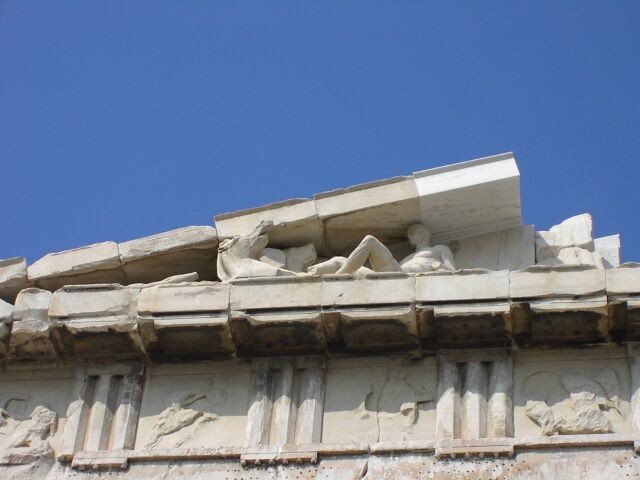 MÈTOPA: Part del fris dòric del temple grec . És de forma quadrada i conté escultures o relleus adossats i va alternant amb els tríglifs.